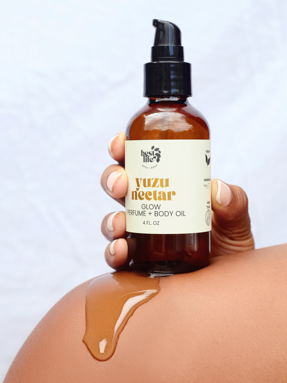 Our Glow Perfume + Body Oils are rich in vitamins and antioxidants that nourish and penetrate the skin to improve texture and radiance. With the addition of pure essential oils and clean fragrance, these oils can be worn as a perfume—by itself or layered—for mood-enhancing aromatherapy and a lingering scent.